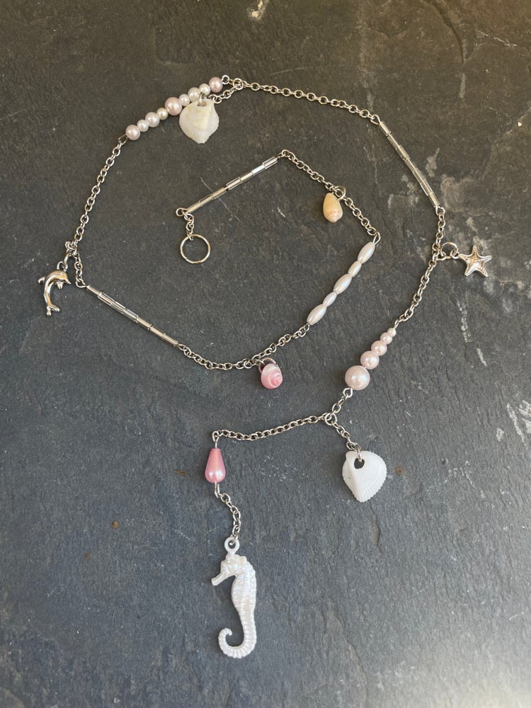 Materials: Stainless Steel chain, locally sourced seahorse button, thrifted seashells & beads.