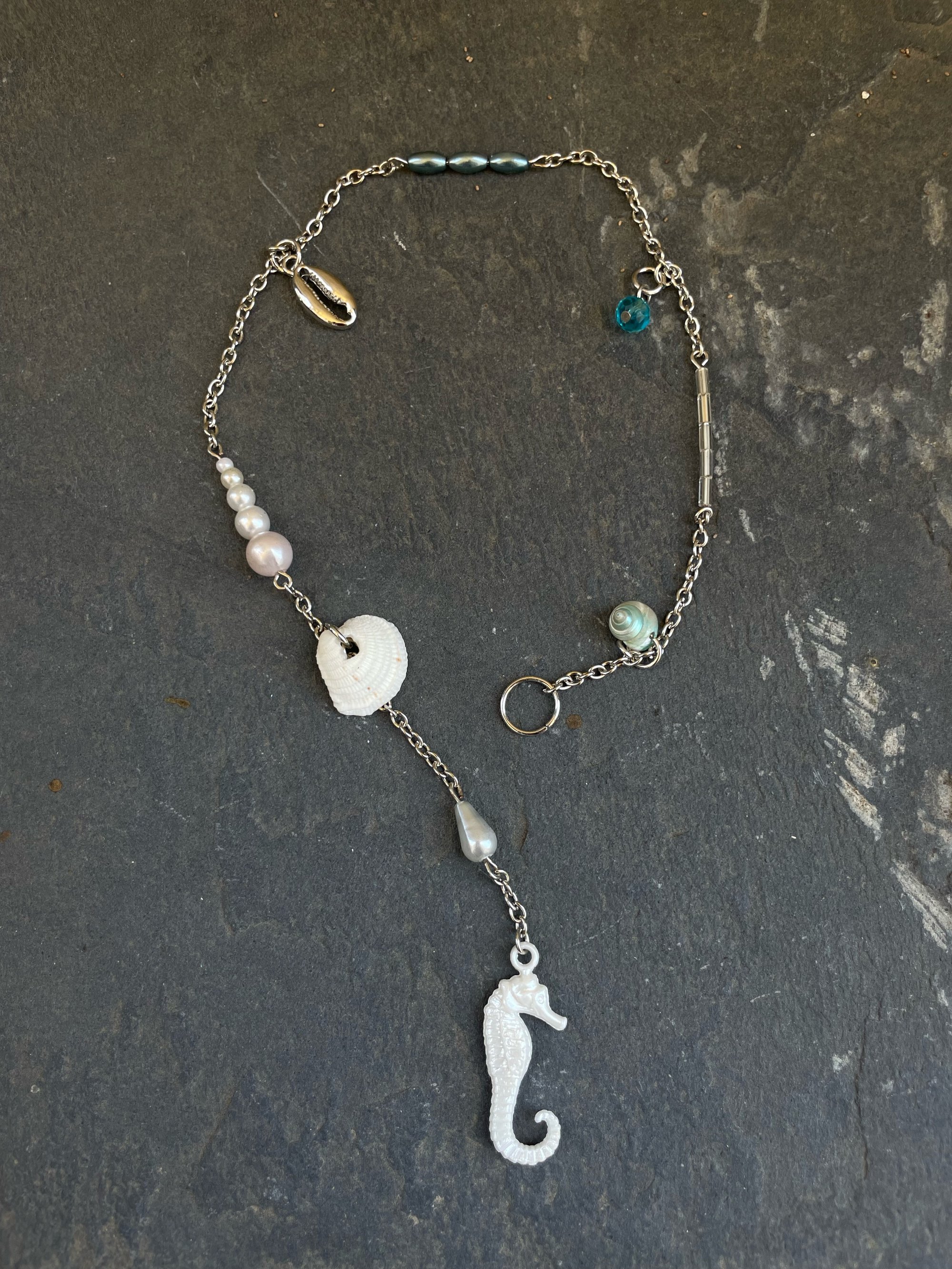 Materials: Stainless Steel chain, locally sourced seahorse button, thrifted seashells & beads.